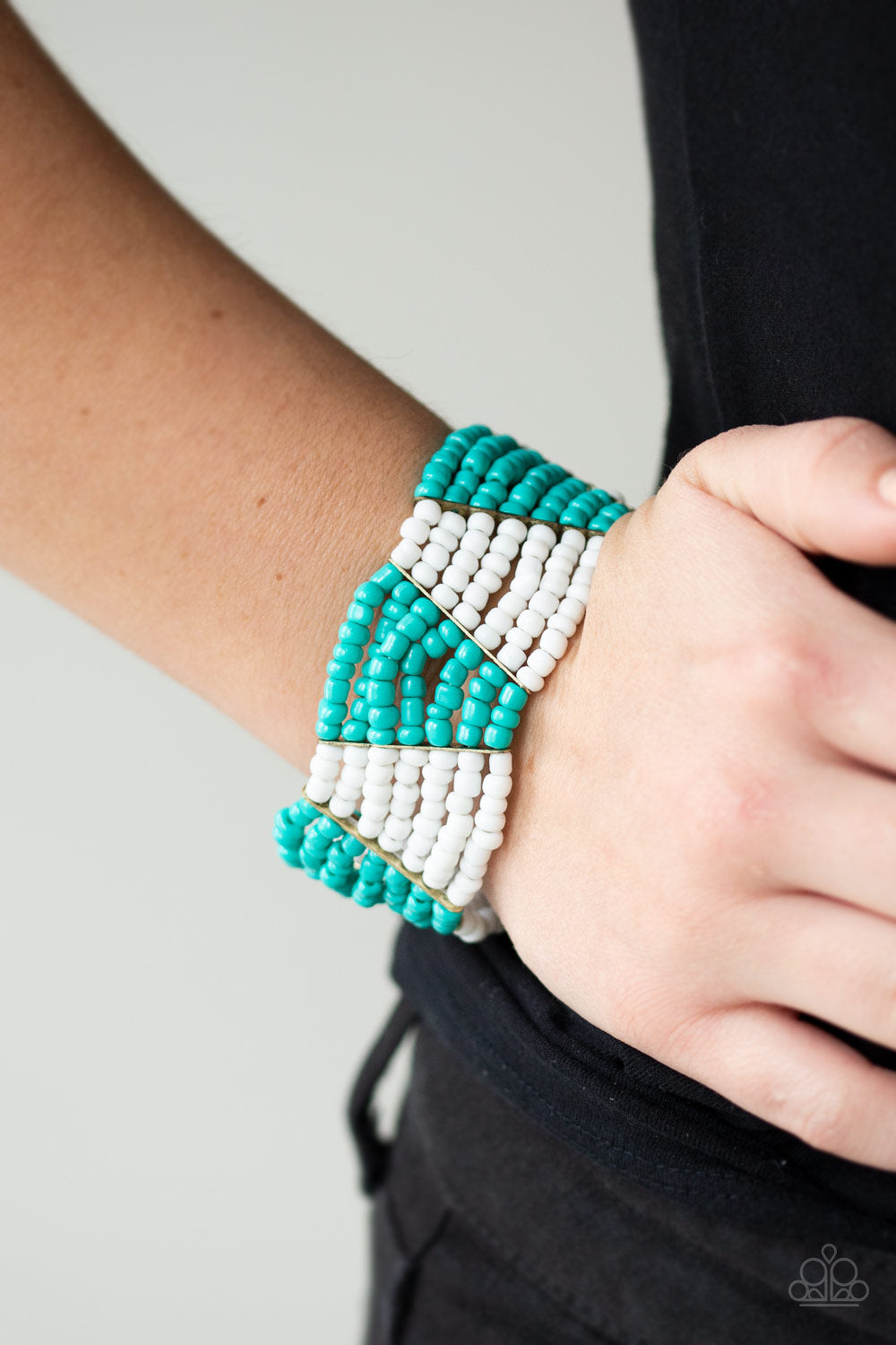 eparated by shimmery brass fittings, a collection of white and turquoise seed beads are threaded along stretchy bands, creating a colorful geometric pattern around the wrist.