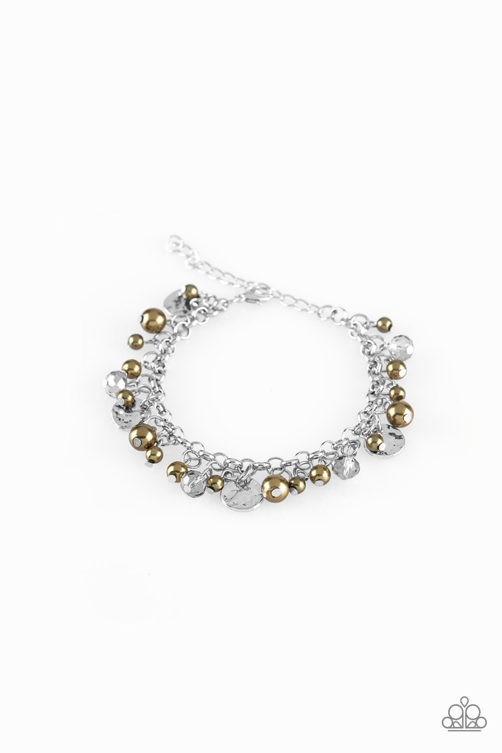 Pearly green beads, smoky crystal-like gems, and hammered silver discs swing from a bold silver chain, creating a refined fringe around the wrist. Features an adjustable clasp closure.